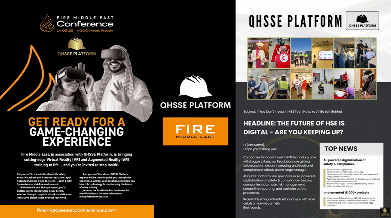 QHSSE PLATFORM is proud to announce a groundbreaking collaboration with Fire Middle East, aimed at redefining fire safety training across the region through Virtual Reality (VR) and Augmented Reality (AR) technologies.